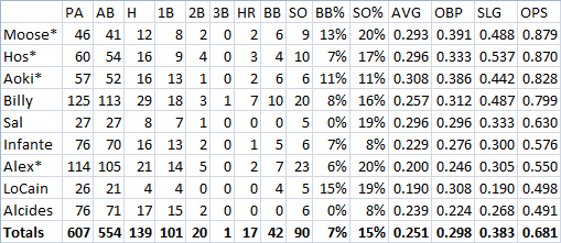 Not a ton of PAs for those top three, but it might be telling that the lefties (sans Alex) have had success against this group. Norris has a huge lefty/righty split in his career: .351 wOBA allowed to lefties vs. .308 to righties.