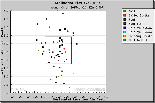 Young made it a point to work inside against the Jays right-handed thunder. His pitch plot from Brooks Baseball against those hitters reveals a plan he executed fairly well. Note the cluster of dark red (fouls) on the inside, just off the zone and also notice the absence of any pitch on the outer quarter of the plate.